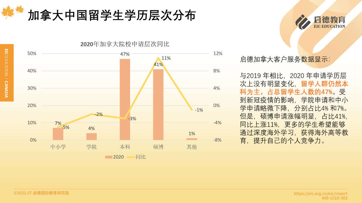 加拿大移民局?jǐn)?shù)據(jù)顯示,2020年入學(xué)的中國(guó)內(nèi)地學(xué)生中,大學(xué)(本、碩、博)階段占比為23.4%,學(xué)院占比7.4%,中小學(xué)占比55%。啟德留學(xué)客戶服務(wù)數(shù)據(jù)顯示,2020年通過啟德申請(qǐng)加拿大留學(xué)的學(xué)生中,本科與碩博的學(xué)生占比分別為47%與41%,學(xué)院和中小學(xué)分別占比4%與7%。