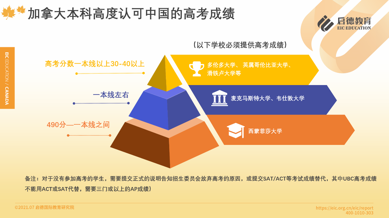 加拿大本科認(rèn)可中國(guó)的高考成績(jī),其中多倫多大學(xué)、英屬哥倫比亞大學(xué)、滑鐵盧大學(xué)等要求高考分?jǐn)?shù)一本線30-40分以上,麥克馬斯特大學(xué)、韋仕敦大學(xué)要求一本線左右,西蒙菲莎大學(xué)要求490分至一本線之間。沒有參加高考的學(xué)生,需要提交正式的說明告知招生委員會(huì)放棄高考的原因,或提交SAT/ACT等考試成績(jī)替代(其中英屬哥倫比亞大學(xué)高考成績(jī)不能用ACT或SAT代替,需要三門或以上的AP成績(jī))。