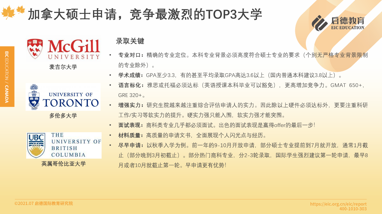 據(jù)啟德留學(xué)加拿大項(xiàng)目介紹,加拿大碩士申請(qǐng)競(jìng)爭(zhēng)最激烈的三所大學(xué)為麥吉爾大學(xué)、多倫多大學(xué)與英屬哥倫比亞大學(xué)。申請(qǐng)人 GPA至少達(dá)到3.3,有的甚至要求平均錄取 GPA高達(dá)3.6以上(國(guó)內(nèi)普通本科建議3.8以上);雅思或托福必須達(dá)標(biāo)(英語授課本科專業(yè)可以豁免), GMAT650+, GRE320+;除硬件必須達(dá)標(biāo)外,加拿大名校注重科研、工作 /實(shí)習(xí)等軟實(shí)力的提升;商科類專業(yè)幾乎都必須面試。