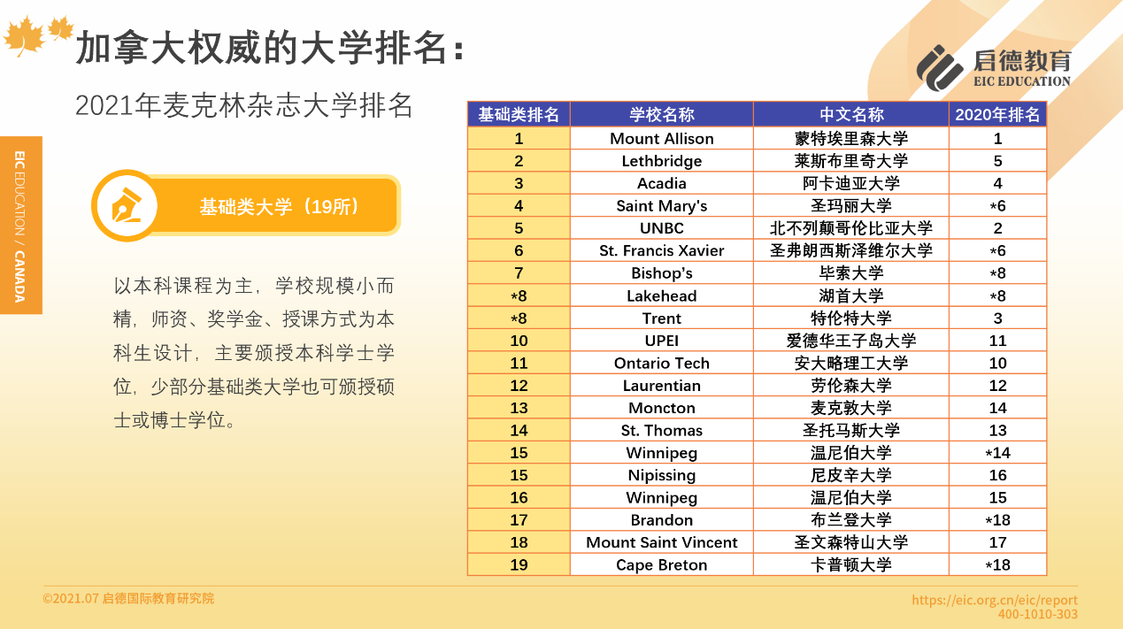 加拿大高校以公立為主,各具特色與優(yōu)勢(shì),教育質(zhì)量在官方評(píng)價(jià)體系中并沒有顯著區(qū)別,因此,啟德教育建議,在選擇院校時(shí),除了參考麥克林雜志排名,還應(yīng)該通過院校官網(wǎng)或者留學(xué)顧問,更全面地了解加拿大高校的實(shí)力。麥克林排名根據(jù)加拿大大學(xué)的類型,分為醫(yī)博類、綜合類、基礎(chǔ)類三個(gè)排名,值得一提的是,連續(xù)21年位于基礎(chǔ)類大學(xué)排名榜首的蒙特艾莉森大學(xué),是加拿大本科畢業(yè)生中獲得羅德獎(jiǎng)學(xué)金人數(shù)最多的學(xué)校,羅德獎(jiǎng)學(xué)金又被稱為“全球本科生諾貝爾獎(jiǎng)”。此外,基礎(chǔ)類排名第19的卡普頓大學(xué),在最近一期的Analytics Insight雜志中,與美國(guó)麻省理工學(xué)院、英國(guó)華威大學(xué)等一同入選了2021年10家最著名的分析和數(shù)據(jù)科學(xué)機(jī)構(gòu)。