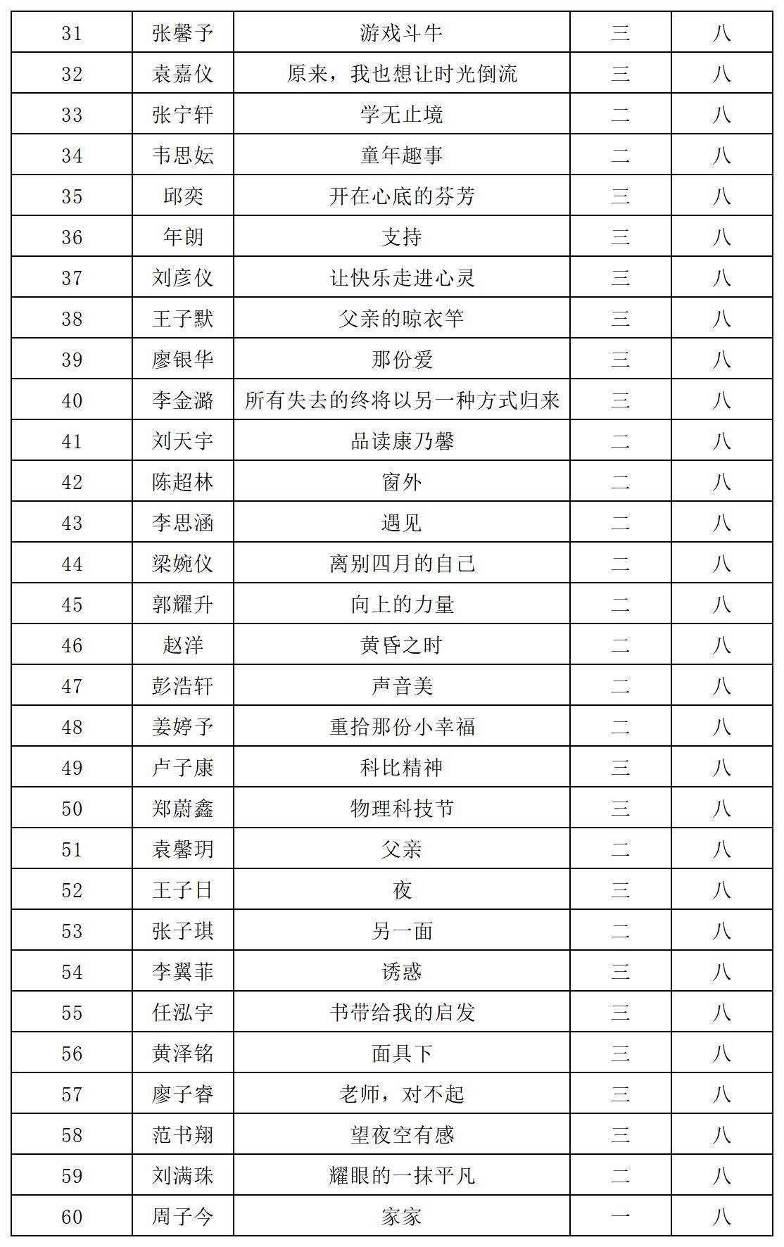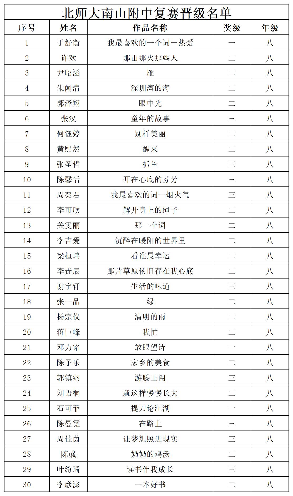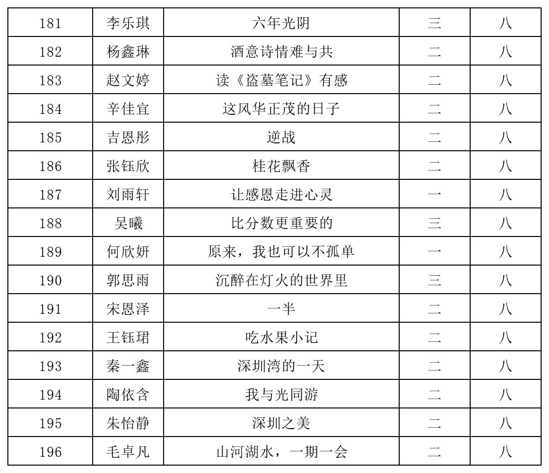 自2021年1月,活動(dòng)征稿啟動(dòng)以來(lái),獲得了深圳市廣大中小學(xué)生、教師、文學(xué)愛(ài)好者的熱烈響應(yīng)積極參與,吸引了深圳百余所學(xué)校的上萬(wàn)人關(guān)注報(bào)名?,F(xiàn)公布北師大南山附屬學(xué)校中學(xué)部晉級(jí)復(fù)賽名單如下: