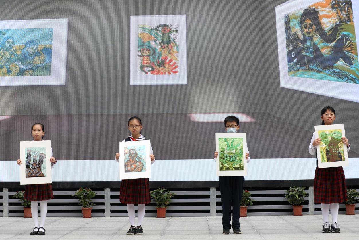 與開館和展覽同時推出的,還有“榕”美術(shù)館的云展館。云展館以新媒體形式,擴大了展覽范圍,使得學(xué)校的美術(shù)美育成果得以向外部展示。推出之際,學(xué)校舉行了云展館的剪彩儀式。解署昱校長致辭并宣布開館,福田區(qū)教科院藝術(shù)辦林影萍主任、解署昱校長、劉權(quán)祥副校長、姚紅霞副校長為云美術(shù)館剪彩,并向全校學(xué)生贈送了云展館資料。