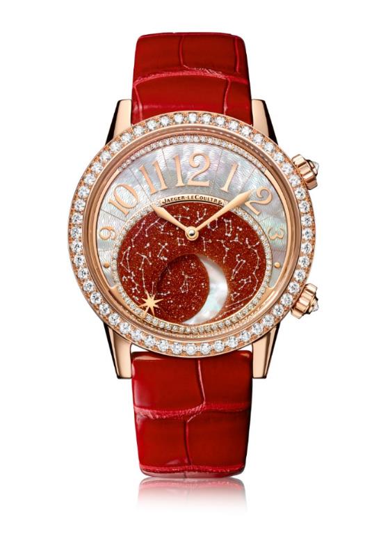 ????積家Rendez-Vous Moon約會系列月相腕表玫瑰金款呈現(xiàn)奔放熱情的迷人魅力,精致閃耀的表殼宛如一曲獻(xiàn)給璀璨夜空的頌歌。腕表以無限詩意展現(xiàn)大工坊制表大師的精湛技藝,浩瀚縹緲的星空圖案鐫刻于腕表之上,令人沉醉。熱情的火光色彩“鋪滿”玫瑰金表殼之上,紫紅色砂金石表盤呈現(xiàn)北半球的浩渺蒼穹。表盤和表殼均以鉆石鑲嵌,流光溢彩。珍珠母貝打造的一彎明月在浩瀚星空中緩緩移動,與顯示數(shù)字時標(biāo)的表盤采用相同工藝打造,散發(fā)皎潔光彩。一枚星形指針,以最富詩意的方式提示著佩戴者下一個約會的時間。