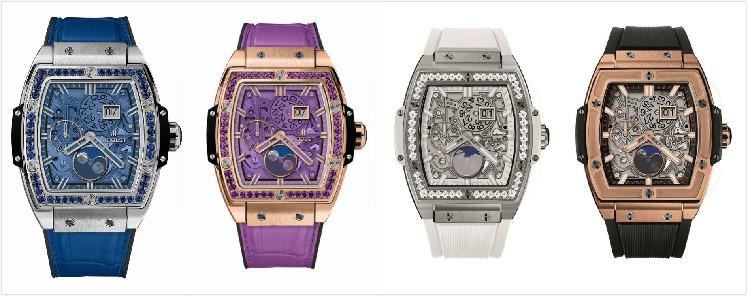 左起:宇舶表Big Bang靈魂系列月相鈦金藍色,宇舶表Big Bang靈魂系列月相王金紫色,