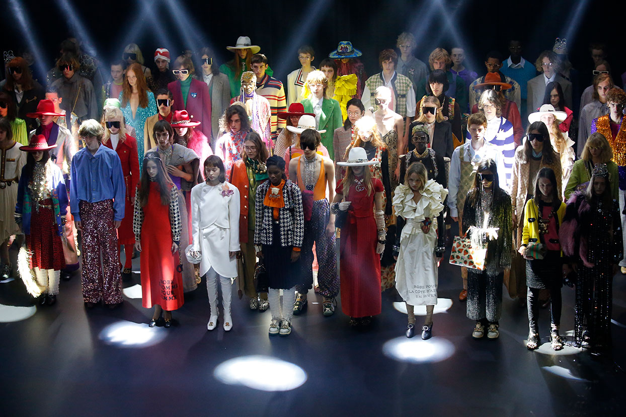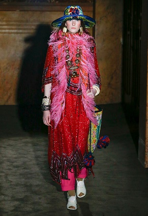 熊梓淇穿著Gucci2018秋冬系列Look49飾動漫圖案拼接大衣,條紋襯衣,搭配米色休閑長褲及Flashtrek系列運動鞋。