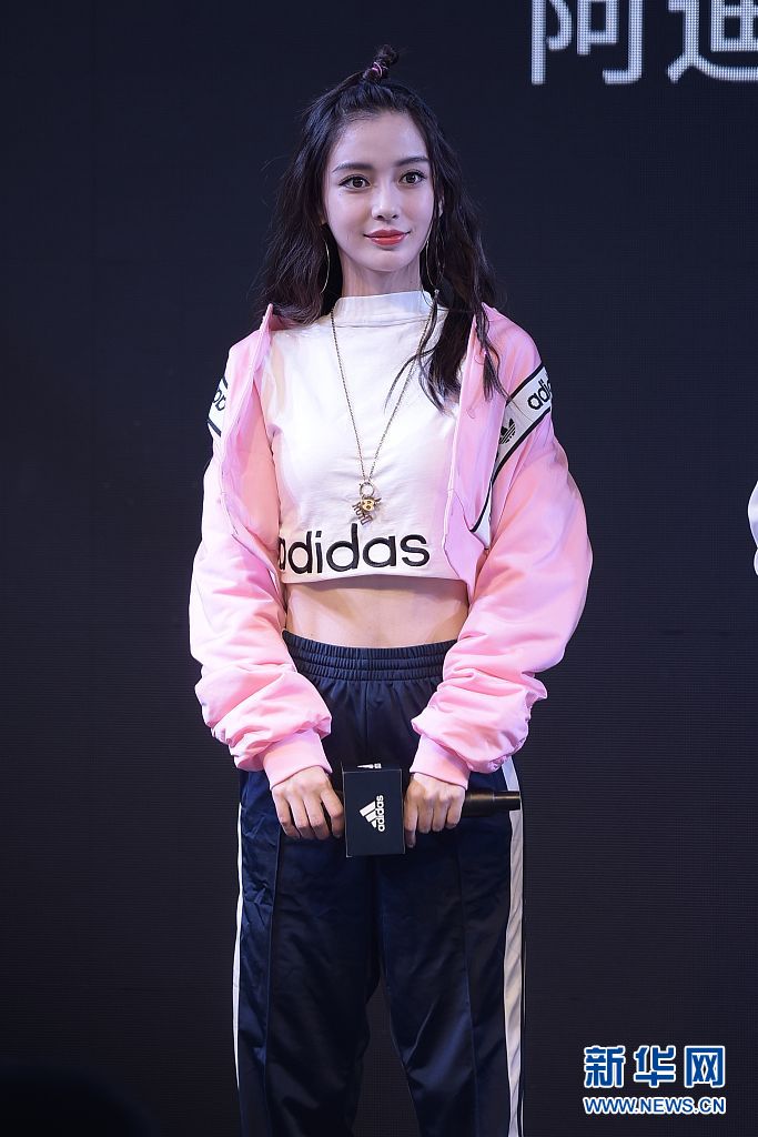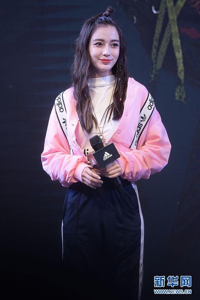 Angelababy粉色夾克+運(yùn)動(dòng)褲 梳蘋果頭嬌俏