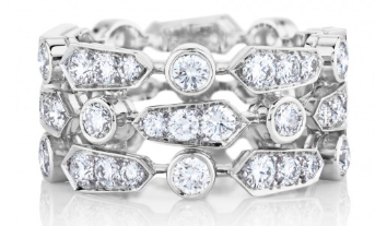 | De Beers戴比爾斯Classic五行戒指 18K白金傳遞著經(jīng)典而現(xiàn)代的時尚宣言??傊?.75克拉。密鑲。戒指寬度:13 mm。 |