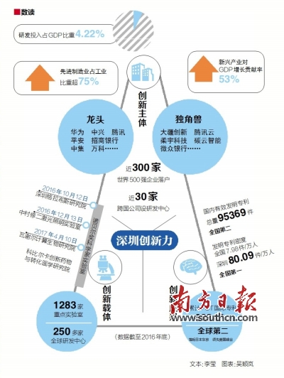 其一,企業(yè)主導(dǎo),政府給力。在整個(gè)創(chuàng)新體系中,企業(yè)是技術(shù)創(chuàng)新主體,代表著市場(chǎng)取向;政府是制度創(chuàng)新的主體,主要任務(wù)是營(yíng)造良好的創(chuàng)新環(huán)境,彌補(bǔ)市場(chǎng)失靈的不足。只有處理好政府和市場(chǎng)的關(guān)系,才能推動(dòng)整個(gè)創(chuàng)新體系不斷完善。因此,深圳一方面讓企業(yè)唱主角,支持企業(yè)創(chuàng)新創(chuàng)業(yè),華為、中興、騰訊、比亞迪等“龍頭”企業(yè)持續(xù)做大做強(qiáng),大疆創(chuàng)新、光啟、柔宇科技等“獨(dú)角獸”企業(yè)迅速發(fā)展;另一方面,政府從政策和規(guī)劃層面加強(qiáng)創(chuàng)新體系頂層設(shè)計(jì),圍繞科技管理機(jī)制創(chuàng)新、創(chuàng)業(yè)創(chuàng)新能力提升、強(qiáng)化對(duì)外合作等方面構(gòu)建政策支持體系,以企業(yè)為創(chuàng)新驅(qū)動(dòng)核心、以企業(yè)家群體為創(chuàng)新精神內(nèi)核、政策金融人才協(xié)同共生的創(chuàng)新生態(tài)系統(tǒng)加速形成。