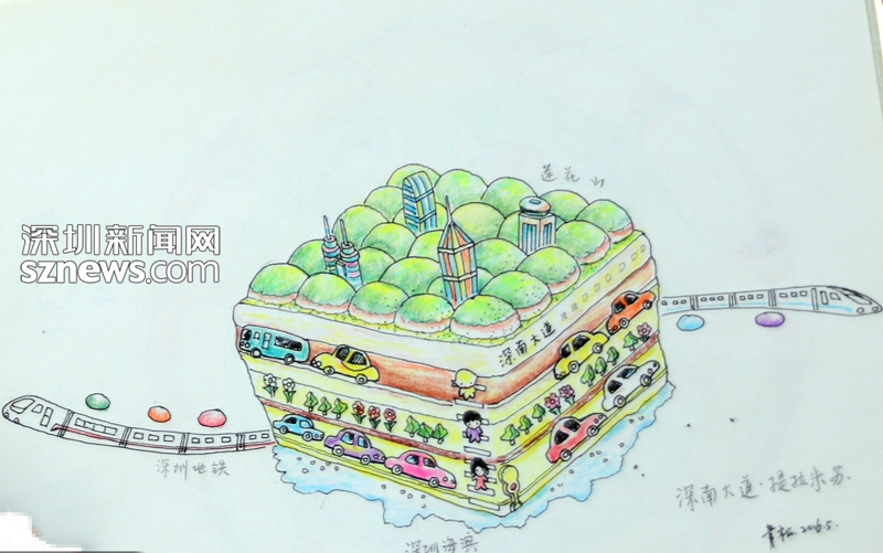 青松告訴記者,2008年剛到深圳時,他就被市民中心的造型所吸引,畫下了上面這幅畫