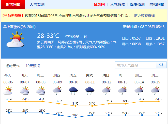 多云仍是今日深圳天氣的主格調(diào),部分時間陽光猛烈,局部還會出現(xiàn)短時陣雨或雷陣雨。氣溫較高,最低氣溫在28℃左右,最高氣溫升至33℃左右,北部及人口密集區(qū)的氣溫將達(dá)34-35℃。外出應(yīng)注意防曬,中午前后應(yīng)減少戶外活動。