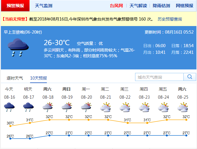 市氣象臺(tái)預(yù)計(jì),8月16日受臺(tái)風(fēng)"貝碧嘉"外圍環(huán)流影響,深圳多間歇性的降雨,局部暴雨;沿海和高地最大陣風(fēng)可達(dá)6至7級(jí)。預(yù)計(jì)8月17日有陣雨;8月18日至20日多云有短時(shí)陣雨,天氣趨于炎熱。