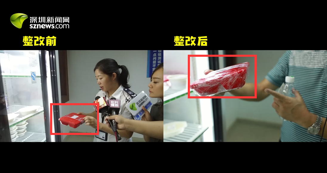 29日突查發(fā)現(xiàn),該公司留樣柜“留樣食品有漏汁”。今日深圳新聞網(wǎng)回訪發(fā)現(xiàn),該問題已得到整改,留樣食品已用保鮮膜密封。