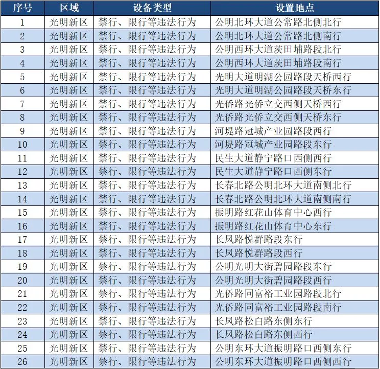 另外,重點整治機動車禁行、限行等多種違法行為的交通技術(shù)監(jiān)控設(shè)備,深圳交警公布啟用87套。涉及福田區(qū)、羅湖區(qū)、南山區(qū)、寶安區(qū)、龍崗區(qū)、龍華區(qū)、光明新區(qū)、坪山區(qū)、大鵬新區(qū)等9個區(qū)域。
