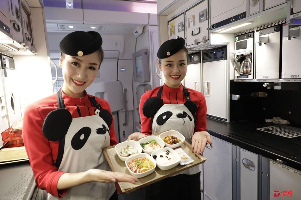 除了色彩繽紛的熊貓彩繪之外,機(jī)艙內(nèi)的熊貓?jiān)仉S處可見,仿佛把大熊貓基地搬上了天。