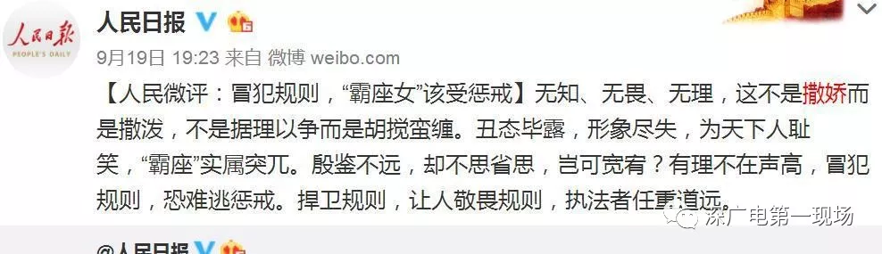 對(duì)此,@人民日報(bào)官方微博昨晚發(fā)表評(píng)論【冒犯規(guī)則,“霸座女”該受懲戒】:無知、無畏、無理,這不是撒嬌而是撒潑,不是據(jù)理以爭而是胡攪蠻纏。丑態(tài)畢露,形象盡失,為天下人恥笑,“霸座”實(shí)屬突兀。殷鑒不遠(yuǎn),卻不思省思,豈可寬宥?有理不在聲高,冒犯規(guī)則,恐難逃懲戒。捍衛(wèi)規(guī)則,讓人敬畏規(guī)則,執(zhí)法者任重道遠(yuǎn)。