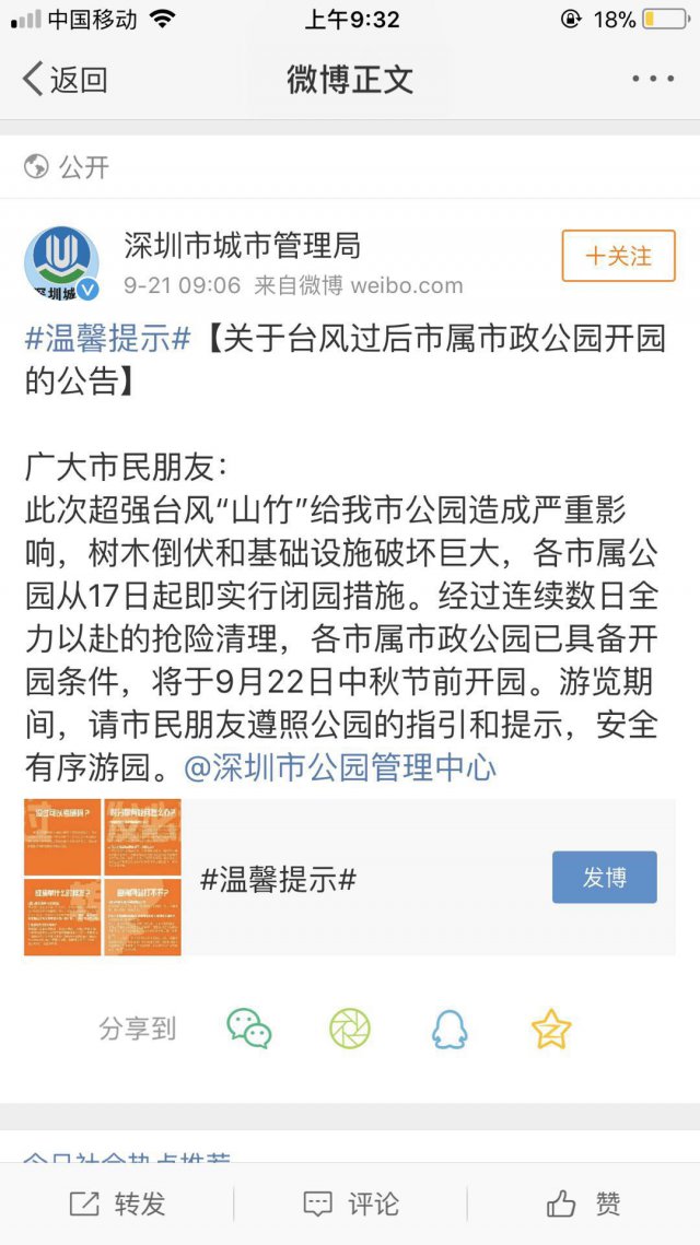 9月21日,深圳市公園管理中心發(fā)布公告: