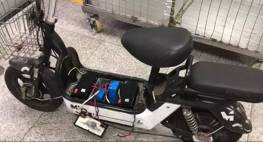 “當(dāng)時(shí)看到這名旅客電單車的腳踏板位置比車身其他位置要干凈一些、新一些,就進(jìn)行了檢查。檢查發(fā)現(xiàn)腳踏板可以直接掀起來,里面的電池盒外表也比較新,這就不太正常了?!爆F(xiàn)場關(guān)員介紹道。隨后,關(guān)員對(duì)電動(dòng)單車電池盒進(jìn)行了拆卸。