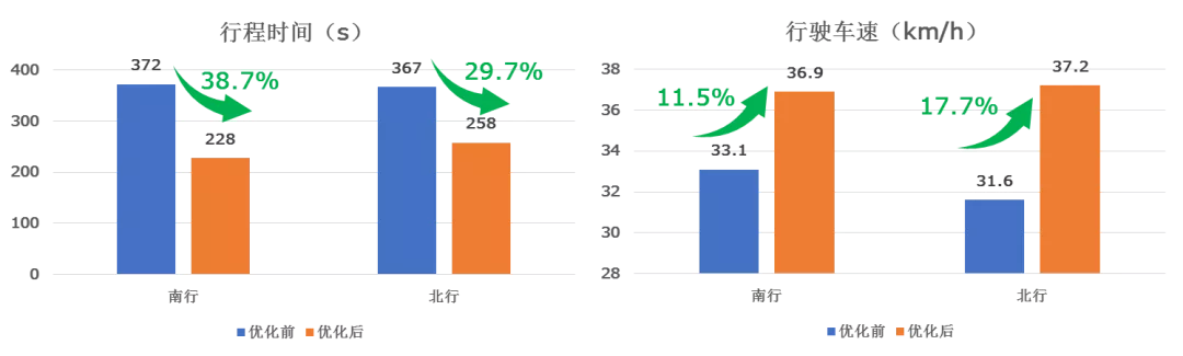錦程路全長(zhǎng)約4.4km,為進(jìn)一步提升路段行車舒適性,9月5日,深圳交警重新優(yōu)化錦程路(萬(wàn)安-沙福)協(xié)調(diào)子區(qū),優(yōu)化后南往北平均行程時(shí)間由367s降至258s,降幅29.7%,平均行駛速度由31.6km/h提升到37.2km/h,提升17.7%;北往南平均行程時(shí)間由372s降至228s,降幅38.7%,平均行駛速度由33.1km/h提升到36.9km/h,提升11.5%。