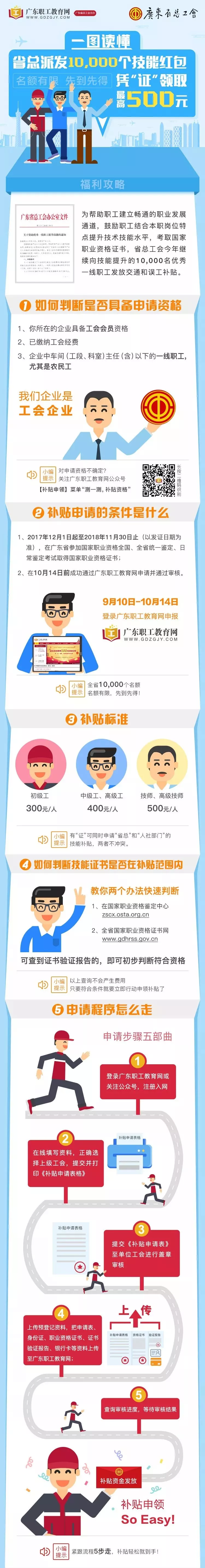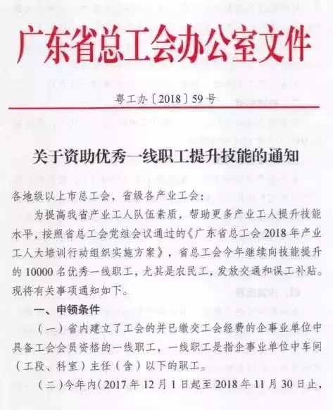 為提高我省產業(yè)工人隊伍素質,幫助更多產業(yè)工人提升技能水平,按照省總工會黨組會議通過的《廣東省總工會2018年產業(yè)工人大培訓行動組織實施方案》,省總工會繼續(xù)向10000名技能提升的優(yōu)秀產業(yè)工人發(fā)放交通和誤工補貼。取得職業(yè)資格證書可獲300~500元補貼,名額有限,先到先得!