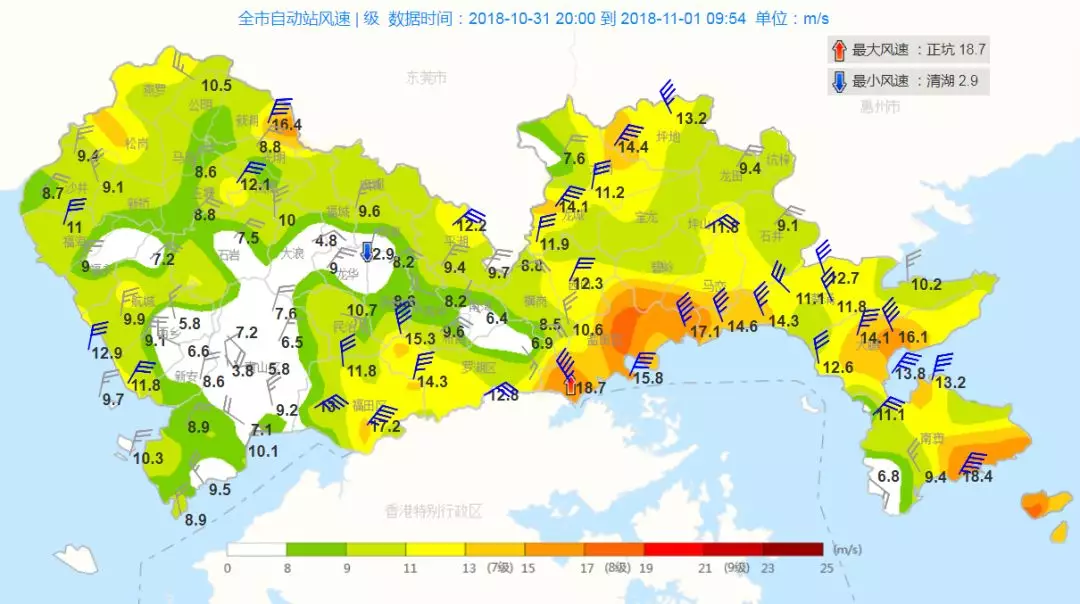 受“玉兔”疊加冷空氣影響,11月1日凌晨我市沿海和高地風(fēng)力已經(jīng)出現(xiàn)5-6級陣風(fēng),最大陣風(fēng)8級出現(xiàn)在鹽田區(qū)沙頭角街道正坑站。
