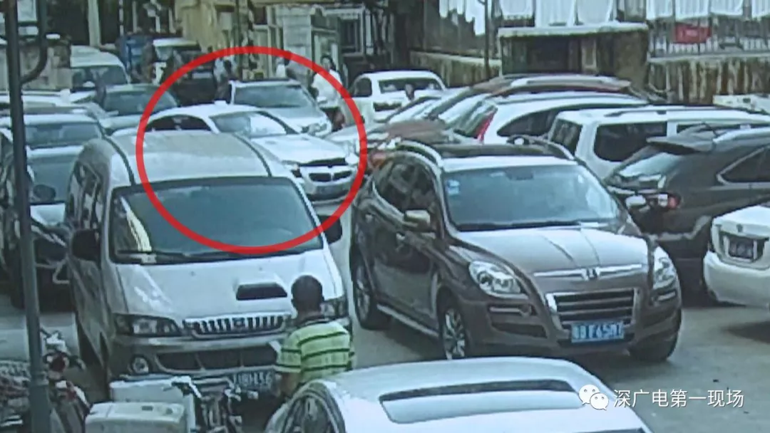 從監(jiān)控畫面中可以看到,粵E牌白色寶馬小車,在原本就擁擠的停車路段內,不停地前進倒退,走著奇怪的路線,在倒車時他接連將停放路旁的車輛撞了個遍,隨后便卡在了路中。