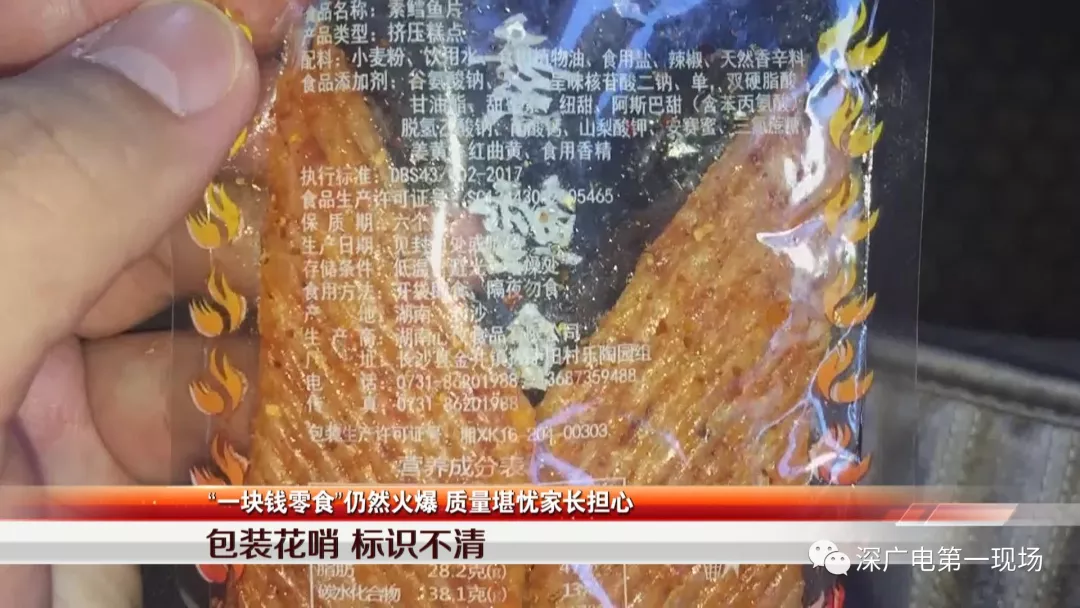 記者在這些食品外包裝上,發(fā)現(xiàn)有一部分包裝上標(biāo)有生產(chǎn)日期、食品生產(chǎn)許可證編號和廠家地址電話,但也有一部分商品外包裝印刷粗糙,本該清楚標(biāo)明的信息模糊不清,難以辨認(rèn)。