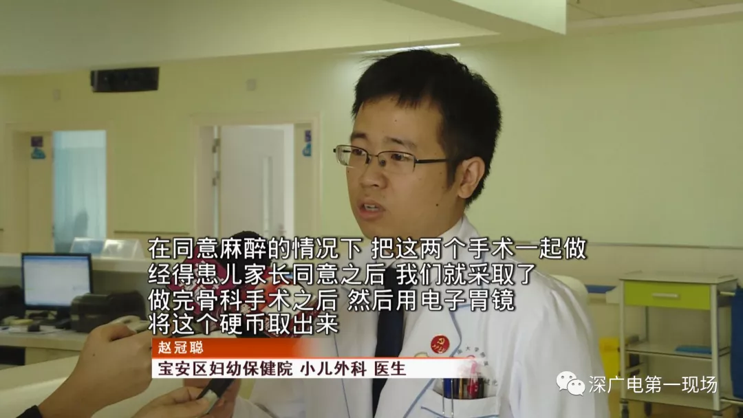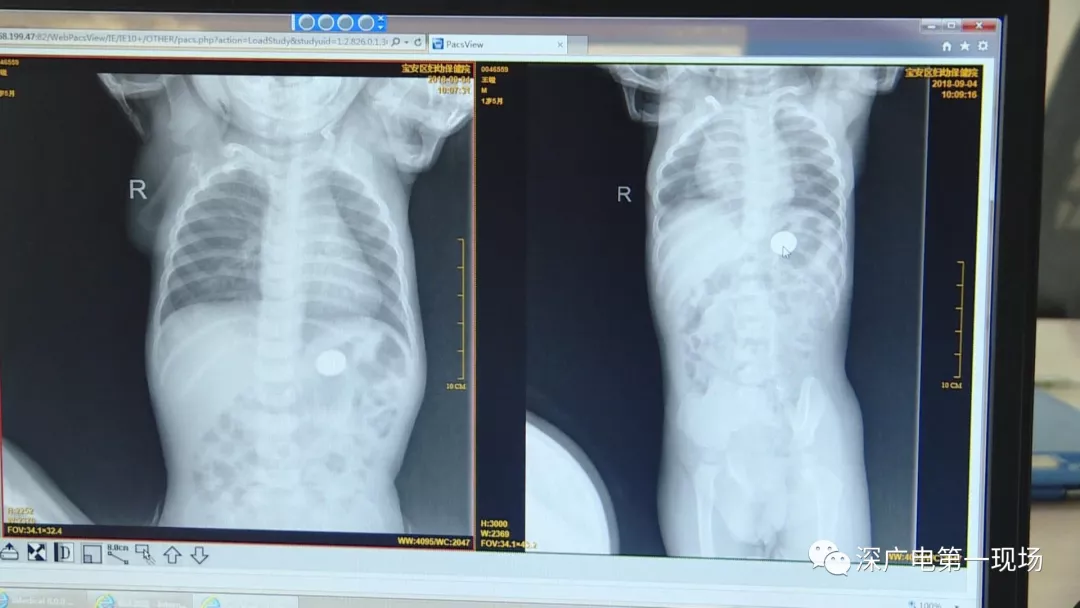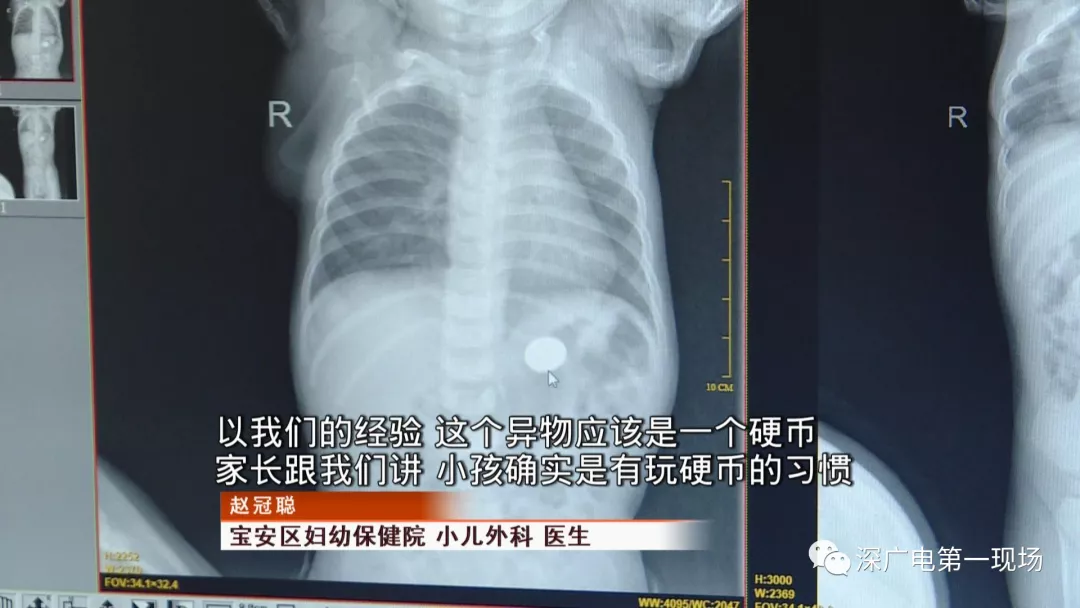 9月4號,一名1歲零5個月的男嬰因在家中摔傷,被父母送到了寶安區(qū)婦幼保健院,醫(yī)生診斷為左側尺橈骨骨折。在進行全麻手術之前,院方例行對嬰兒進行了周身檢查。手術前,兒外科醫(yī)生趙冠聰在查看患者的胸片時,發(fā)現(xiàn)這名嬰兒的胃部有一枚硬幣大小的暗影。
