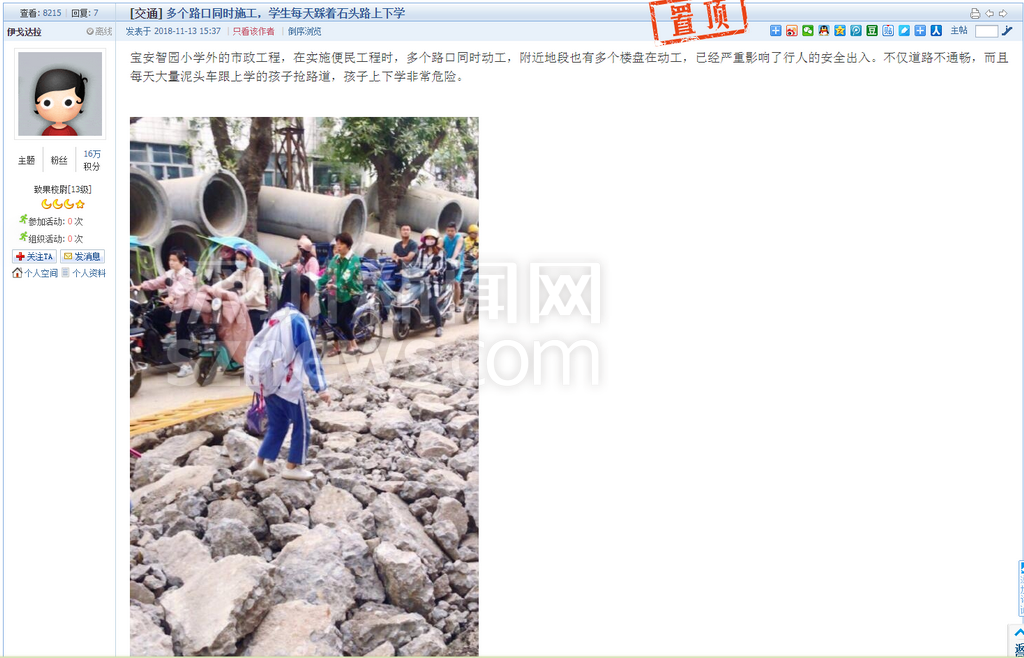 另有網(wǎng)友跟帖表示:同學(xué)們求學(xué)路坎坷,看得揪心!從現(xiàn)場圖可以看到,學(xué)生上下學(xué)都要穿過工地。路面被挖開,道路邊上只留下很窄的一條小道。上下學(xué)高峰期,成群結(jié)隊的學(xué)生在碎石穿行,旁邊小道上行人、三輪、電動單車堵成一鍋粥,存在很大的安全隱患。