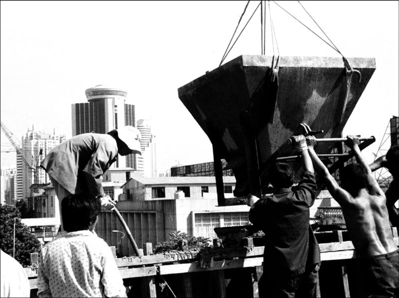 1985年,建設(shè)者們?cè)谏钲诨疖囌救诵刑鞓蚴┕ぁ?呂翔 攝