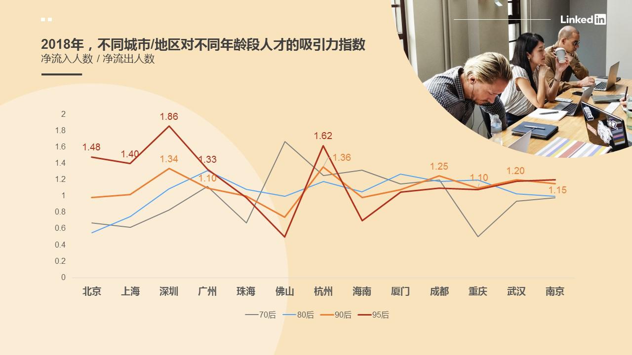 在2018年對95后最具吸引力的前五名城市分別為:深圳、杭州、北京、上海和廣州。但到了90后,當(dāng)經(jīng)歷了第一份工作、積累了一定工作經(jīng)驗(yàn)后,一線城市的吸引力開始下降:深圳、廣州排名尚且靠前,但北京、上海的吸引力已顯著下降,一批新一線城市取而代之成為了年輕人的下一個選擇。2018年,90后年輕人的職場第二步普遍開始于杭州、深圳、成都、武漢、南京、廣州、重慶等城市。
