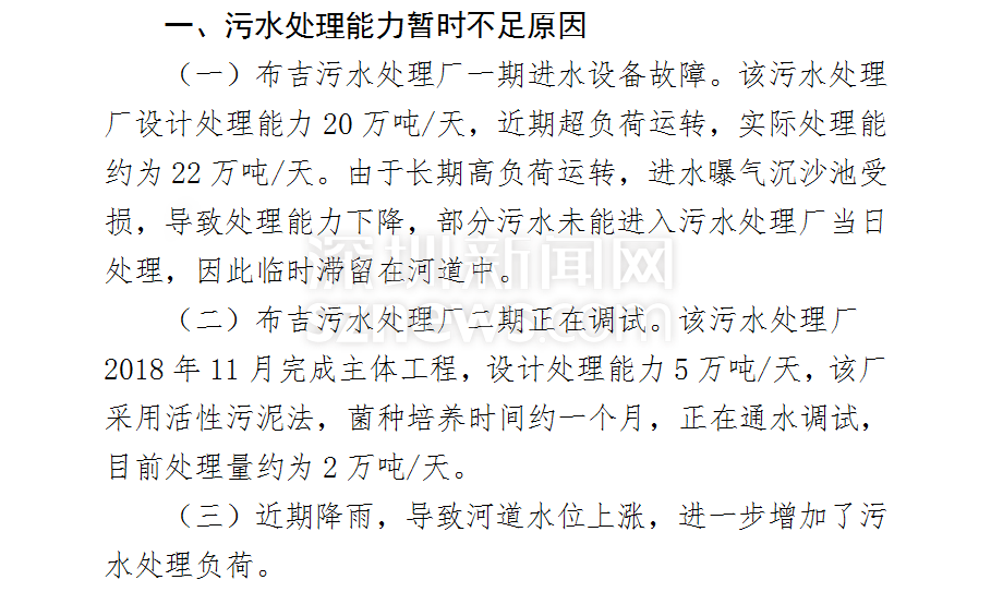在其復(fù)函中,明確說明了河道黑臭的原因主要為該片區(qū)污水處理能力暫時不足(片區(qū)污水產(chǎn)生量約為26萬噸/天,目前實(shí)際污水處理量約為24萬噸/天),為防止生活污水直排下游,臨時設(shè)置橡膠壩,生活污水臨時滯留河道所致。