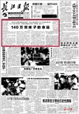 《140萬雙襪子的命運(yùn)》于1997年7月30日首發(fā)于長江日報(bào)一版,獨(dú)家報(bào)道了武漢襪廠倉庫里積存了兩火車皮襪子,其中最長的沉睡了10年,但是面對眾多商家訂單,工廠卻長年不肯“吐貨”,商家開價(jià)越來越低,襪子在一天天貶值。此報(bào)道一出,轟動(dòng)全國,多家媒體轉(zhuǎn)載,并獲得第八屆中國新聞獎(jiǎng)一等獎(jiǎng)。
