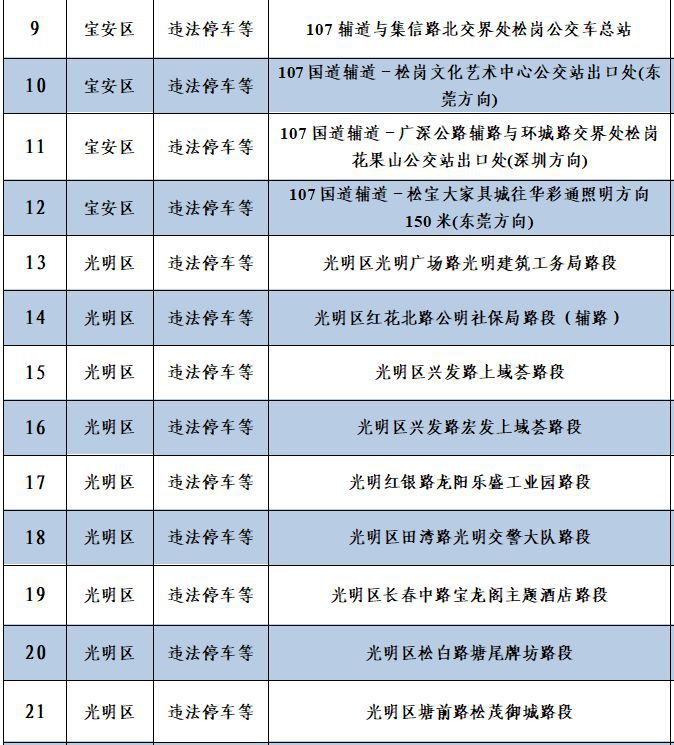 深圳新聞網(wǎng)12月10日訊(記者 何暢)據(jù)“深圳交警”微信公眾號消息,深圳56套“電子警察”新上線,其中46套專門查處違法停車,4套用于查處泥頭車違反禁行限行規(guī)定,6套用于查處沖紅燈、逆行、進(jìn)入導(dǎo)向車道變更車道等違法行為。56套“電子警察”具體分布位置如下: