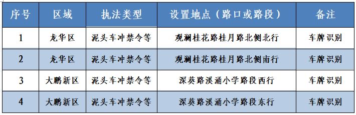4套車牌識(shí)別監(jiān)控設(shè)備可用于查處泥頭車違反禁行限行規(guī)定等交通違法行為。位于龍華區(qū)的觀瀾桂花路桂月路和大鵬新區(qū)的深葵溪涌小學(xué)路段。