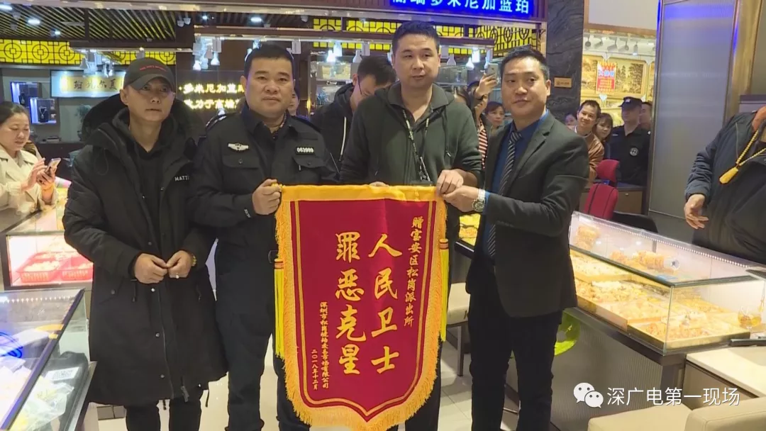琥珀被盜后的第十天,松崗派出所民警在湖南將嫌疑人沒來得及出手的琥珀全部追回。11日上午,松崗派出所民警來到松崗琥珀交易市場,把被盜的琥珀歸還給事主寇先生??芟壬c琥珀交易市場給派出所民警送上錦旗表示感謝。