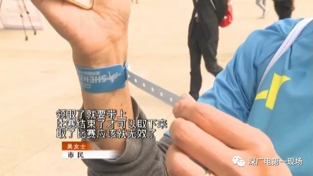 今天中午,已經(jīng)有不少要參與本次馬拉松比賽的市民,前往市民中心廣場領(lǐng)取號碼簿和參賽包。吳女士今年是第一次參加馬拉松全程的比賽。在領(lǐng)取的物品中,有一個藍(lán)色手環(huán)比較特別。