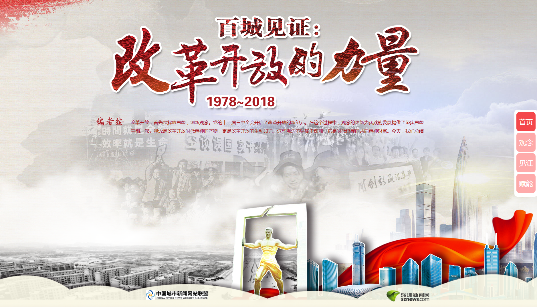 此次活動(dòng)由中國(guó)城市新聞網(wǎng)站聯(lián)盟主辦,深圳新聞網(wǎng)承辦,活動(dòng)在今年10月中國(guó)城市新聞網(wǎng)站聯(lián)盟總編輯聯(lián)席會(huì)上正式啟動(dòng)。專題網(wǎng)頁(yè)采用全新H5技術(shù),用歷史原圖、視頻、音頻和文字交互呈現(xiàn)方式,詮釋改革、實(shí)干、擔(dān)當(dāng)、文明、開(kāi)放、創(chuàng)新等深入民心的改革開(kāi)放觀念,并發(fā)動(dòng)網(wǎng)盟近百家成員單位網(wǎng)站,深入挖掘當(dāng)?shù)爻鞘懈母镩_(kāi)放的生動(dòng)案例和故事,報(bào)道這些代表性觀念對(duì)所在城市發(fā)展的巨大影響,共同描繪改革開(kāi)放40年的生動(dòng)畫(huà)卷。