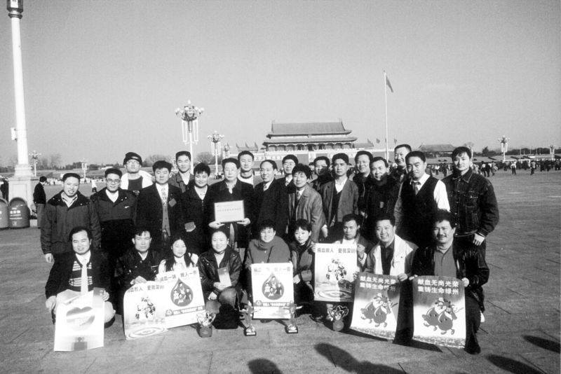 1999年,27位深圳市民獲得全國(guó)首批無償獻(xiàn)血金質(zhì)獎(jiǎng)杯后在天安門前合影。余海蓉?cái)z