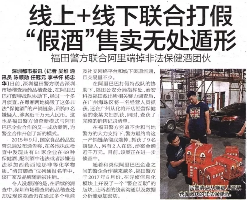 ★★福田警方聯(lián)合深圳市場(chǎng)稽查局藥品稽查處,在阿里巴巴“打假特戰(zhàn)隊(duì)”協(xié)助下,經(jīng)過(guò)一個(gè)多月偵查,于粵湘兩地?fù)v毀了非法“保健酒”的產(chǎn)銷鏈條,刑拘9名嫌疑人,涉案價(jià)值近千萬(wàn)元人民幣。