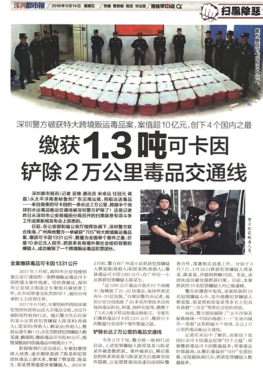 ★★在公安部和省公安廳指揮協(xié)調(diào)下,福田警方作為主力軍,聯(lián)合珠海、廣州兩地警方一舉破獲“705”特大跨境販運(yùn)毒品案,創(chuàng)下我國(guó)打擊可卡因毒品犯罪“四個(gè)之最”:?jiǎn)伟咐U獲毒品可卡因數(shù)量最多;單案毒品價(jià)值最高;從幕后毒梟到“馬仔”全部到案,實(shí)現(xiàn)最縱深打擊;抓獲犯罪嫌疑人數(shù)量最多。
