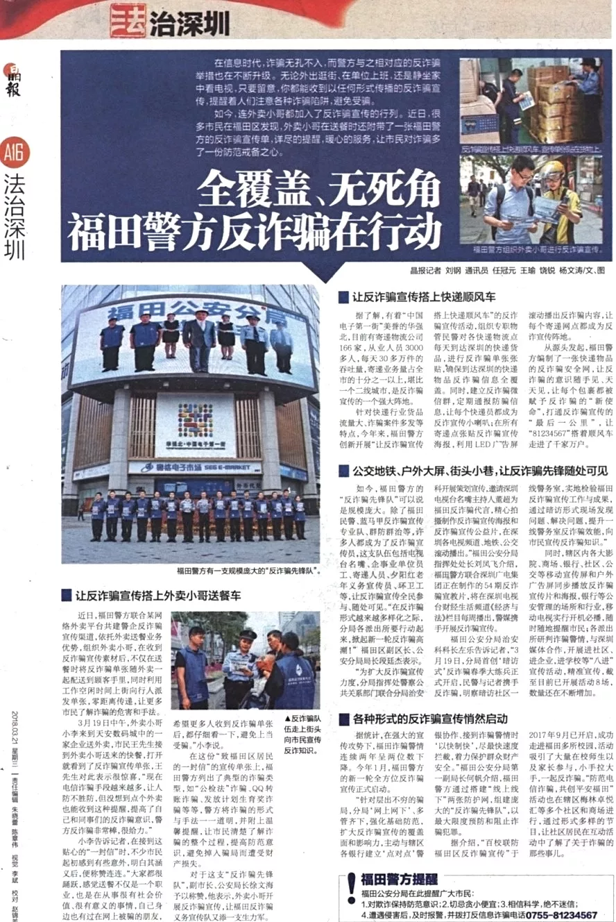 ★★福田警方通過(guò)搭建“線上線下”兩張防護(hù)網(wǎng),組建龐大的“反詐騙先鋒隊(duì)”,多管齊下,擴(kuò)大反詐騙宣傳的覆蓋面和影響力,最大限度預(yù)防和阻止詐騙犯罪。
