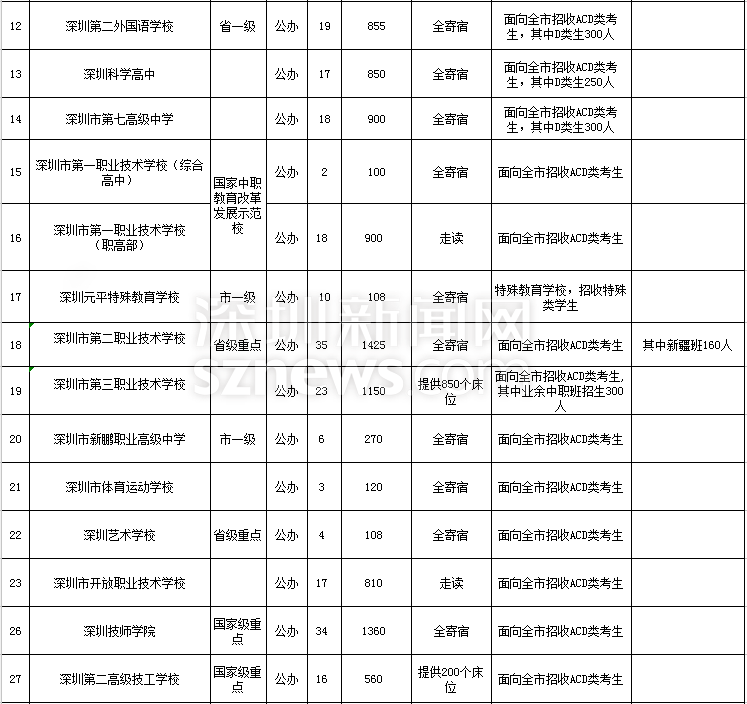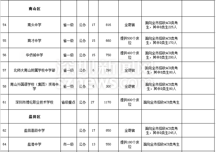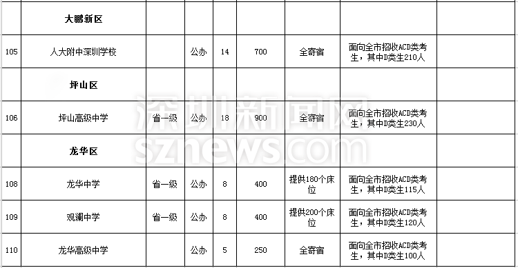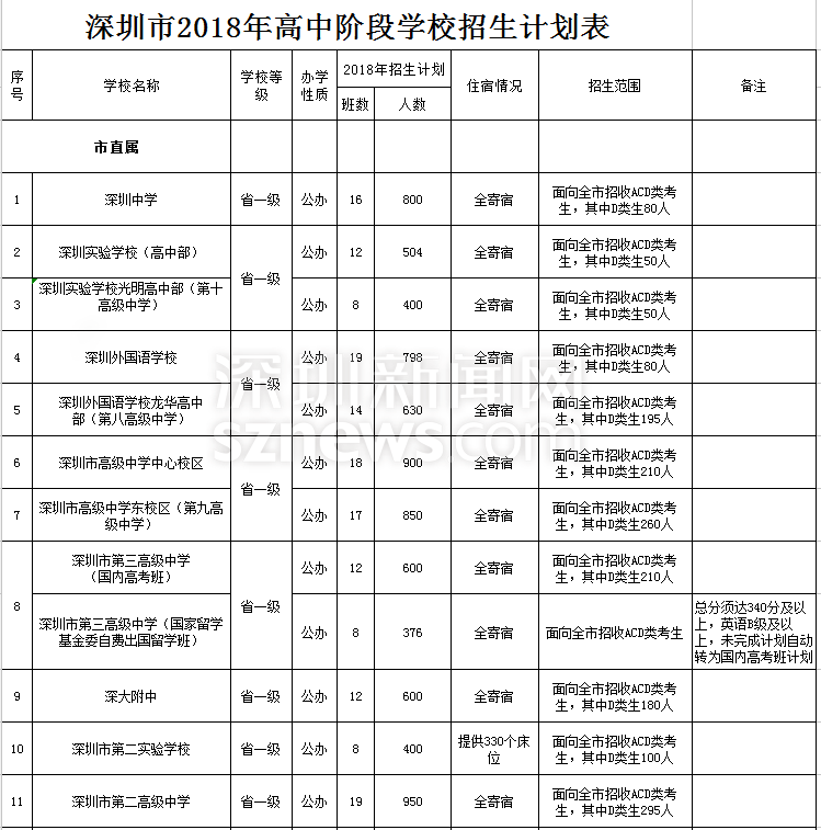 深圳市2018年高中階段學校招生計劃表