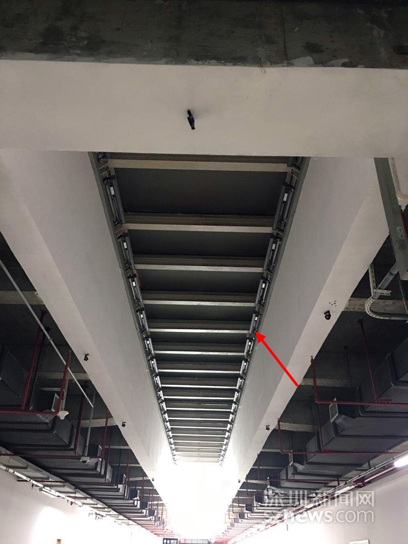激光位移計(jì)安裝在地下車(chē)庫(kù)的頂端(紅色箭頭處),記錄位移數(shù)據(jù)(王啟文供圖)
