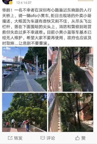 原標題:羅湖一路人騎共享單車飛落天橋墜亡,深圳交警公布事故原因