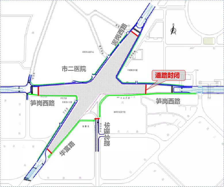施工期間,對泥崗西路、華富路、筍崗西路、華強北路黃木崗立交部分路段進行封閉,隔斷往來交通。