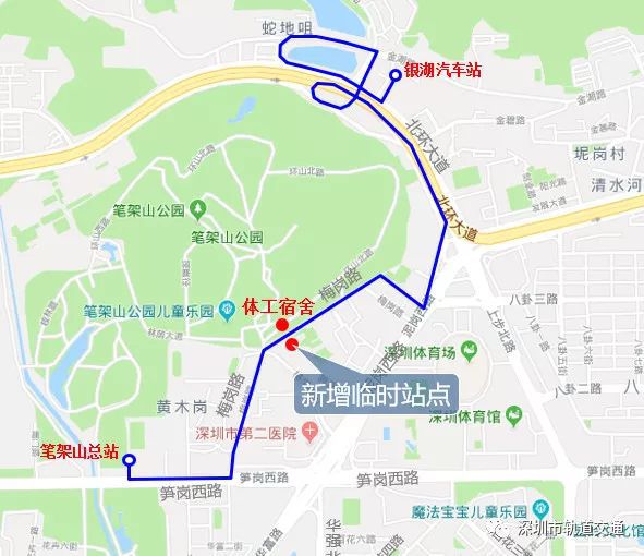 銀湖汽車總站 -筆架山總站(雙向運行),??裤y湖汽車站(銀湖地鐵站)、體工宿舍、市二醫(yī)院①(黃木崗地鐵站)、筆架山總站。