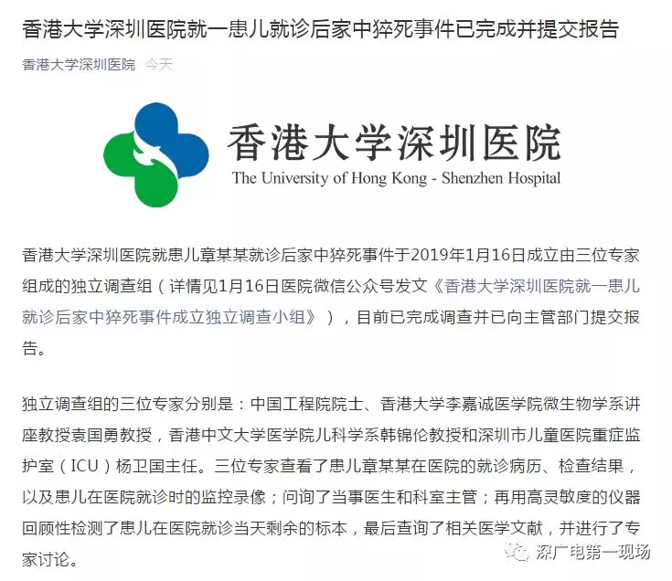 1月31日,香港大學(xué)深圳醫(yī)院再次發(fā)布消息,稱就患兒就診后家中猝死事件已完成調(diào)查并提交報告。全文如下: 香港大學(xué)深圳醫(yī)院就患兒章某某就診后家中猝死事件于2019年1月16日成立由三位專家組成的獨立調(diào)查組(詳情見1月16日醫(yī)院微信公眾號發(fā)文《香港大學(xué)深圳醫(yī)院就一患兒就診后家中猝死事件成立獨立調(diào)查小組》),目前已完成調(diào)查并已向主管部門提交報告。 獨立調(diào)查組的三位專家分別是:中國工程院院士、香港大學(xué)李嘉誠醫(yī)學(xué)院微生物學(xué)系講座教授袁國勇教授,香港中文大學(xué)醫(yī)學(xué)院兒科學(xué)系韓錦倫教授和深圳市兒童醫(yī)院重癥監(jiān)護室(ICU)楊衛(wèi)國主任。三位專家查看了患兒章某某在醫(yī)院的就診病歷、檢查結(jié)果,以及患兒在醫(yī)院就診時的監(jiān)控錄像;問詢了當事醫(yī)生和科室主管;再用高靈敏度的儀器回顧性檢測了患兒在醫(yī)院就診當天剩余的標本,最后查詢了相關(guān)醫(yī)學(xué)文獻,并進行了專家討論。 三位專家已出具了最終調(diào)查報告。報告確定了患兒感染的類型,分析了患兒猝死的原因很可能為心源性并發(fā)癥,并為今后避免類似事件再次發(fā)生提供了建議。報告指出醫(yī)院的診療過程符合專業(yè)規(guī)范。 2019年1月25日上午,醫(yī)院已將報告的內(nèi)容悉數(shù)告知患兒章某某家長,并對家長進行了慰問。同日,醫(yī)院也將報告上報給了主管部門。 由于報告的部分內(nèi)容涉及患兒及其家人隱私,以及報告的部分內(nèi)容依據(jù)《中華人民共和國傳染病防治法》規(guī)定,醫(yī)院沒有權(quán)限向公眾公開,所以醫(yī)院無法公布報告全文。 醫(yī)院一直秉持公開、專業(yè)、科學(xué)的方式處理這一個案,尋求真相,并依此對診療工作進行持續(xù)改進,促進醫(yī)學(xué)的進步。醫(yī)院也正在等待第三方的尸檢結(jié)果。 最后,醫(yī)院對獨立調(diào)查組的三位專家致以誠摯的謝意,感謝他們在短短數(shù)天時間內(nèi),認真、細致、嚴謹?shù)赝瓿闪苏{(diào)查,并撰寫了報告。 香港大學(xué)深圳醫(yī)院 2019年1月31日