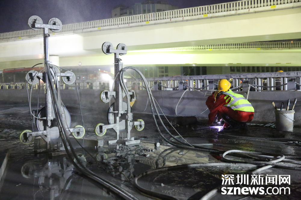 工人正對橋體進行繩鋸切割。