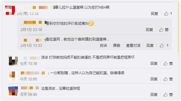 還有一些網(wǎng)友借機(jī)表達(dá)了自己對某類人的"墻裂"不滿?。]事兒拉什么球框啊,以為在打 NBA?。ⅲ⒒钤?,打球就煩不能扣還裝 X的"......
