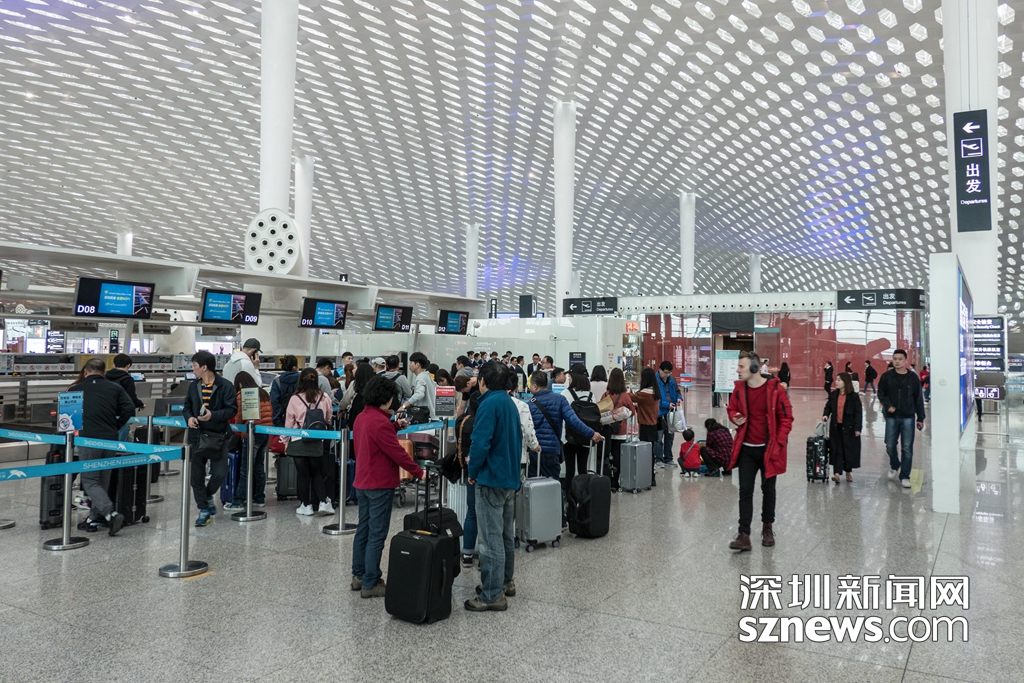 2月3日10:15,寶安機(jī)場(chǎng)出發(fā)大廳,旅客正在辦理行李托運(yùn)手續(xù)(實(shí)習(xí) 生關(guān)天宇攝)